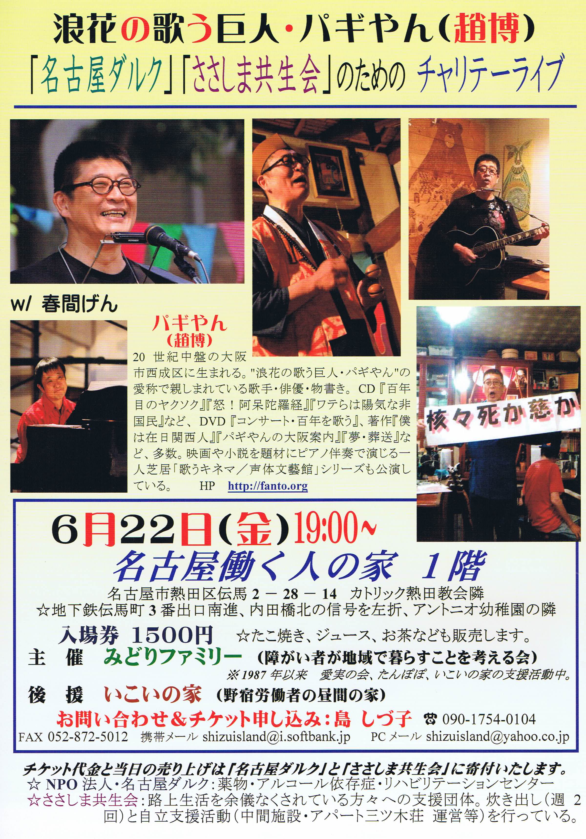 薬物アルコール依存症者を支援する名古屋ダルクと、野宿者支援のささしま共生会の両キリスト教社会団体を支援する為のチャリティーライブ。