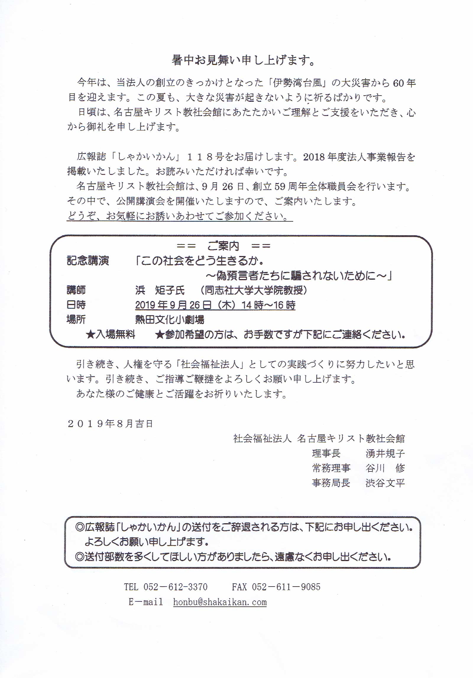 今年創立59周年を迎える名古屋キリスト教社会館の公開講演会。